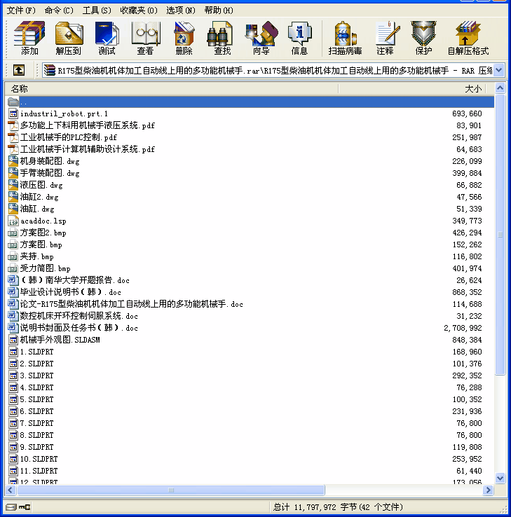 - 摘要: 本次設(shè)計(jì)的多功能機(jī)械手用于R175型柴油機(jī)機(jī)體加工自動(dòng)線上,主要由手爪、手腕、手臂、機(jī)身、機(jī)座等組成,具備上料、翻轉(zhuǎn)和轉(zhuǎn)位等多種功能,并按該自動(dòng)線的統(tǒng)一生產(chǎn)節(jié)拍和生產(chǎn)綱領(lǐng)完成以上動(dòng)作。本機(jī)械手機(jī)身采用機(jī)座式,自動(dòng)線圍繞機(jī)座布置,其坐標(biāo)形式為球坐標(biāo)式,具有立柱旋轉(zhuǎn)、手臂伸縮、手臂俯仰、腕部轉(zhuǎn)動(dòng)和腕部擺動(dòng)5個(gè)自由度;驅(qū)動(dòng)方式為液壓驅(qū)動(dòng),且選用雙聯(lián)葉片泵,系統(tǒng)壓力為2.5MPa,電機(jī)功率為5.5KW,共有整機(jī)回轉(zhuǎn)油缸、手臂俯仰油缸、手臂伸縮油缸、手腕擺動(dòng)油缸、手腕回轉(zhuǎn)油缸、手爪夾緊油缸6個(gè)液壓缸;定位采用機(jī)械擋塊定位,定位精度為0.5~1mm,采用行程控制系統(tǒng)實(shí)現(xiàn)點(diǎn)位控制。